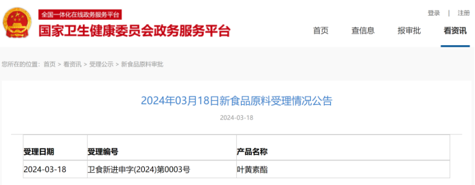 根据“卫生部2008年第12号公告”,卫健委已经批准叶黄素酯为新食品原料。